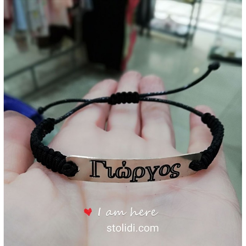 Βραχιόλι με όνομα από μέταλλο αλπακά και μαύρο κορδόνι σε μακραμέ πλέξη