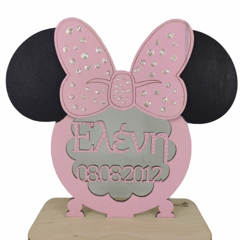 Ξύλινο stand με το όνομα και την ημερομηνία βάπτισης με θέμα τη minnie mouse