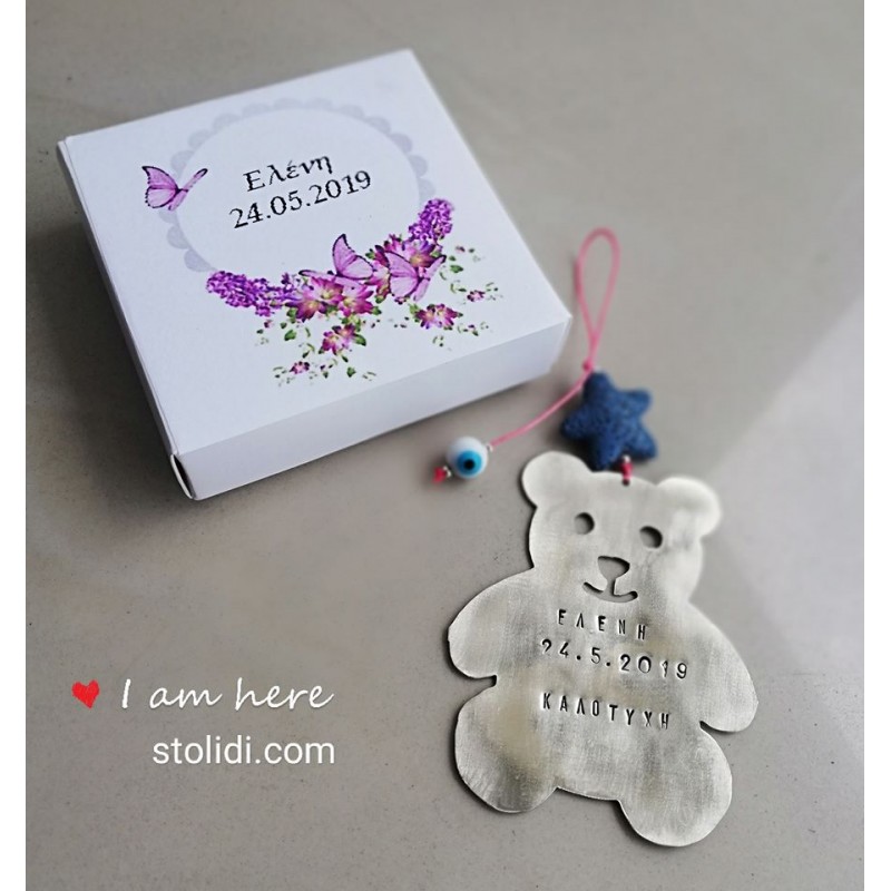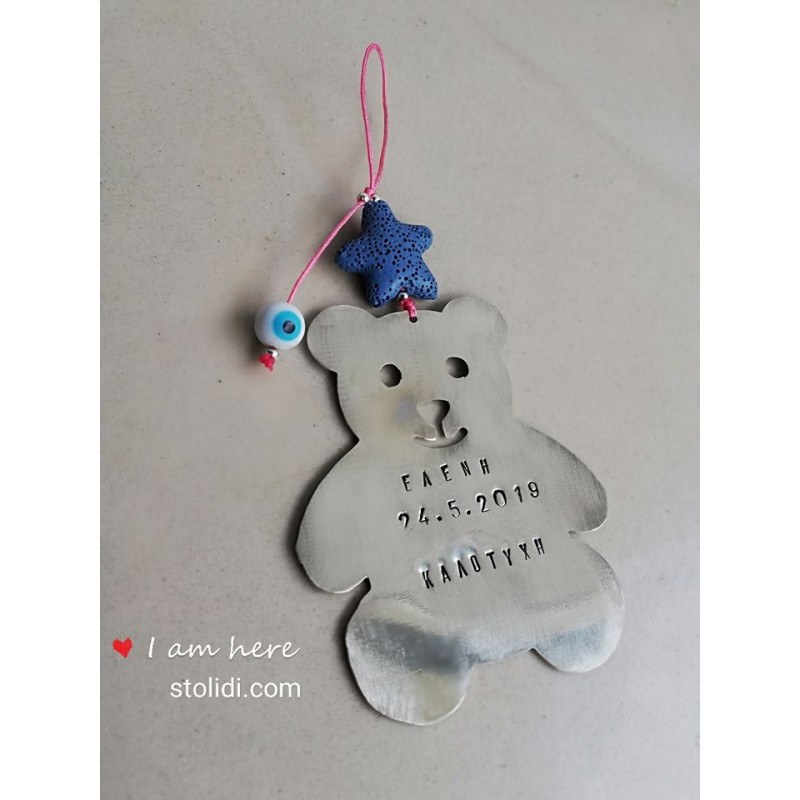 Αρκουδάκι απο μέταλλο και χαραγμένα πάνω η ημερομηνία γέννησης και το όνομα του μωρού.