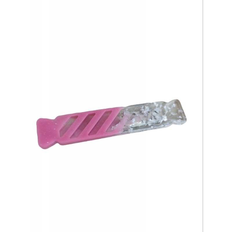 Χειροποίητο παιδικό κλιπ για τα μαλλιά καραμέλα με υγρό γυαλί σε ροζ χρώμα και φύλλα ασημιού Διάσταση 7Χ2 εκ