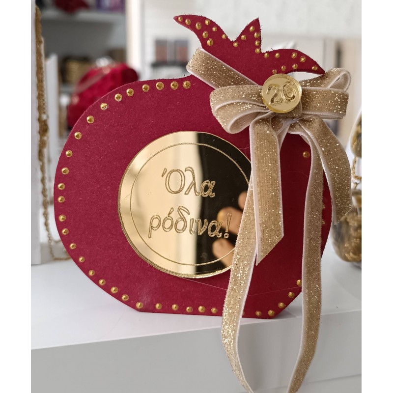 Ετικέτες: Φέτος χαρίστε τύχη, ευημερία και λάμψη στον χώρο σας με το μοναδικό χειροποίητο γούρι–ρόδι, σε εντυπωσιακό κόκκινο χρώμα και λεπτομέρειες από χρυσό πλεξιγκλάς. Κάθε κομμάτι είναι δημιουργημένο με προσοχή στη λεπτομέρεια και διαθέτει επάνω χαραγμένες αγαπημένες ευχές, για να γεμίσει το σπίτι ή το γραφείο σας με θετική ενέργεια για όλη τη νέα χρονιά. Χαρακτηριστικά προϊόντος: Χειροποίητη κατασκευή Κόκκινο ρόδι με χρυσές λεπτομέρειες από premium πλεξιγκλάς Με χαραγμένες ευχές όπως “Όλα ρόδινα”, Ιδανικό για δώρο σε φίλους, οικογένεια ή συνεργάτες Υπέροχο διακοσμητικό για το σαλόνι, το γραφείο ή την είσοδο του σπιτιού Ανανεώστε τον χώρο σας με μια πινελιά γιορτινής κομψότητας ή προσφέρετε ένα δώρο με νόημα που θα μείνει αξέχαστο.