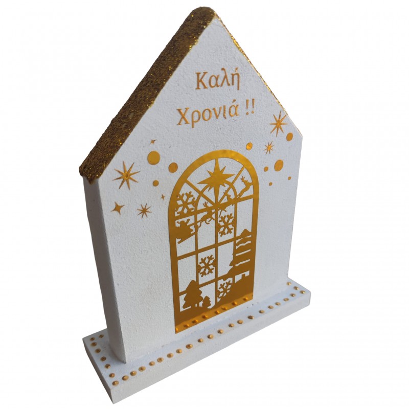 Επιτραπέζιο ξύλινο γούρι, σπίτι σε λευκό με χρυσό Διάσταση 16Χ11 εκ