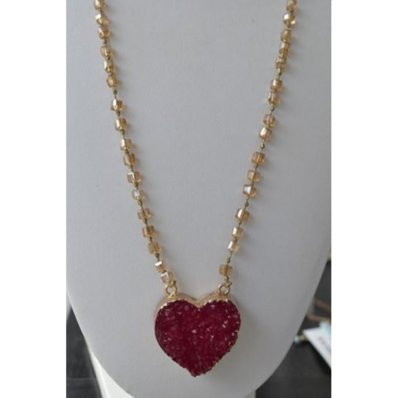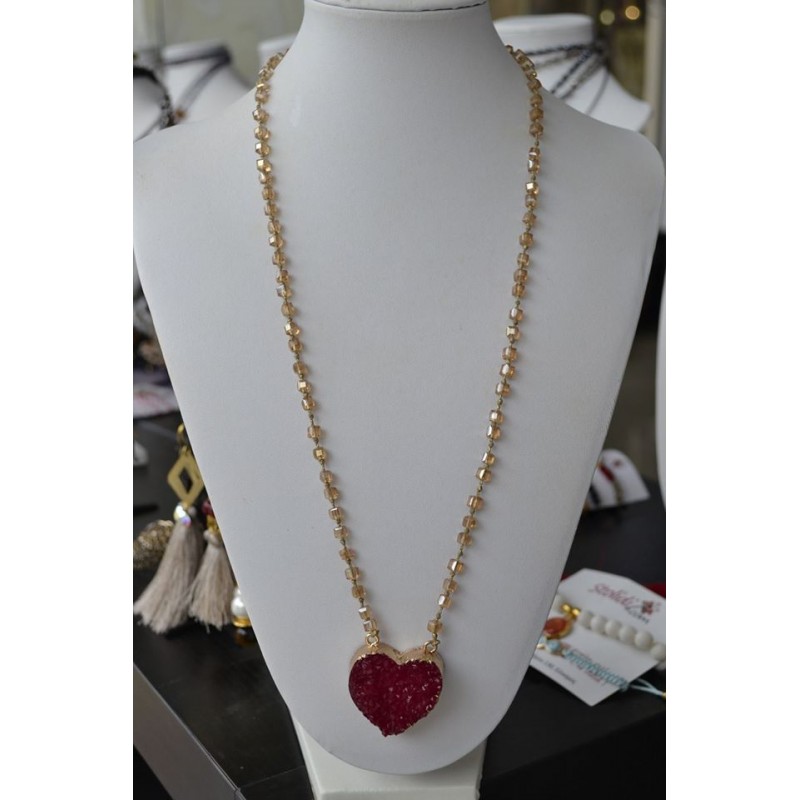 Κολιέ μακρύ στον λαιμό με τετράγωνα μελί κρύσταλλα και καρδιά σε έντονο ροζ χρώμα