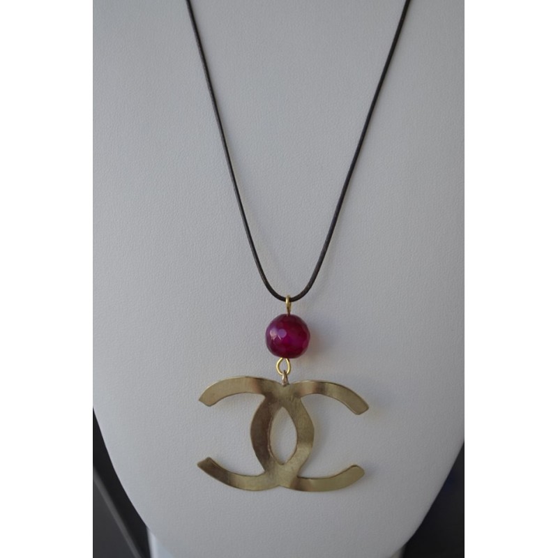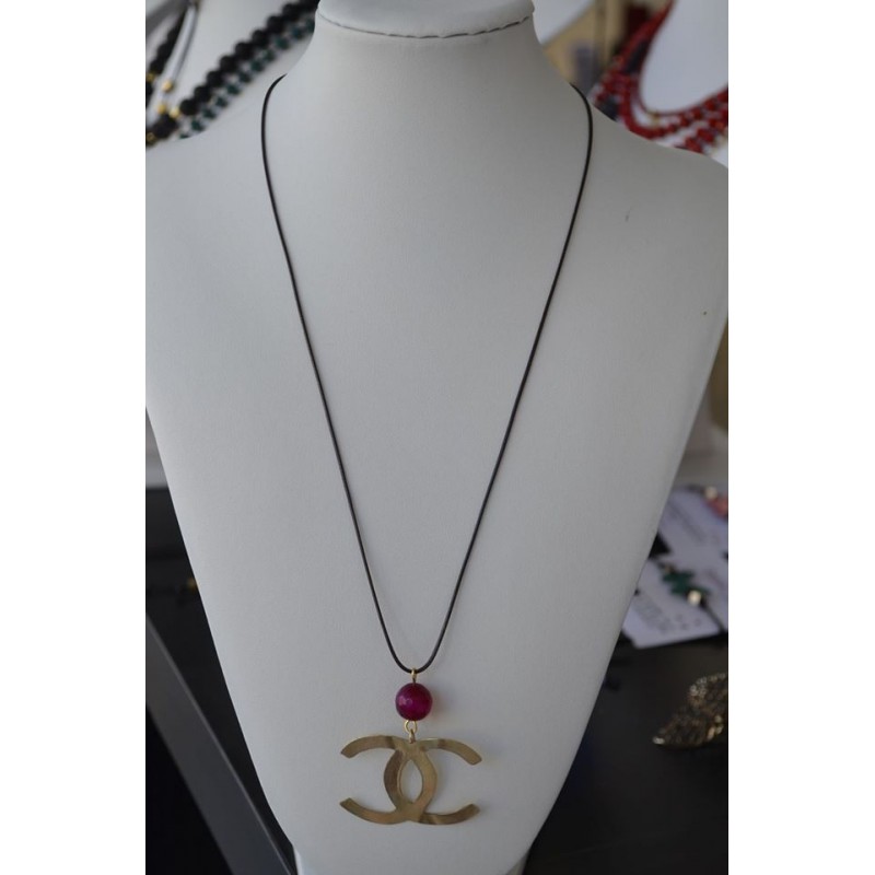 Κολιέ με καφέ δερμάτινο κορδόνι, χειροποίητο σύμβολο chanel και διακοσμητική πέτρα από φουξ αχάτη