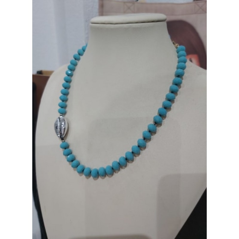 Κοντό κολιέ 43εκ. από γαλάζια κρύσταλλα και ένα ασημένιο κοχύλι.
