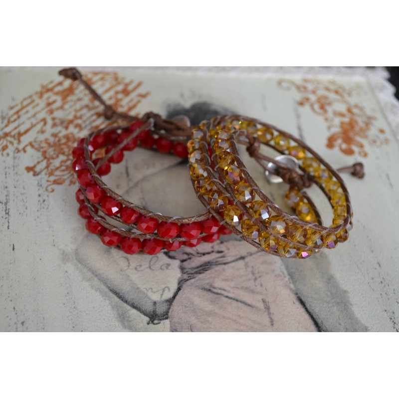 Βραχιόλι με καφέ δερμάτινο κορδόνι και κρύσταλλα σε δύο χρώματα κόκκινο και μελί