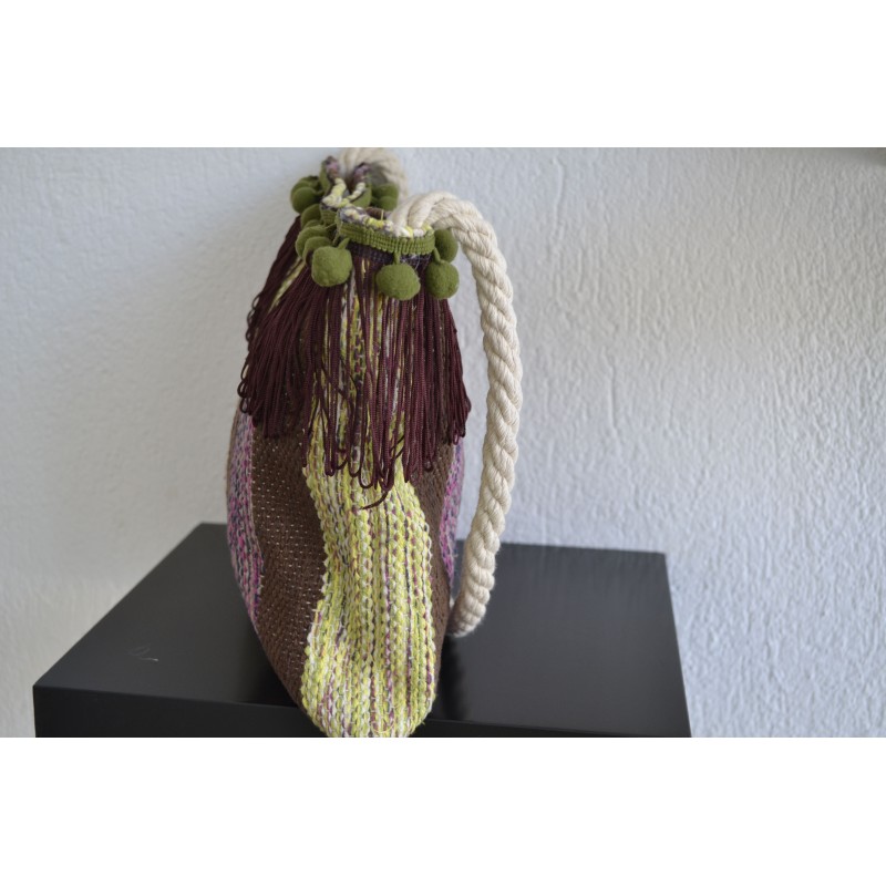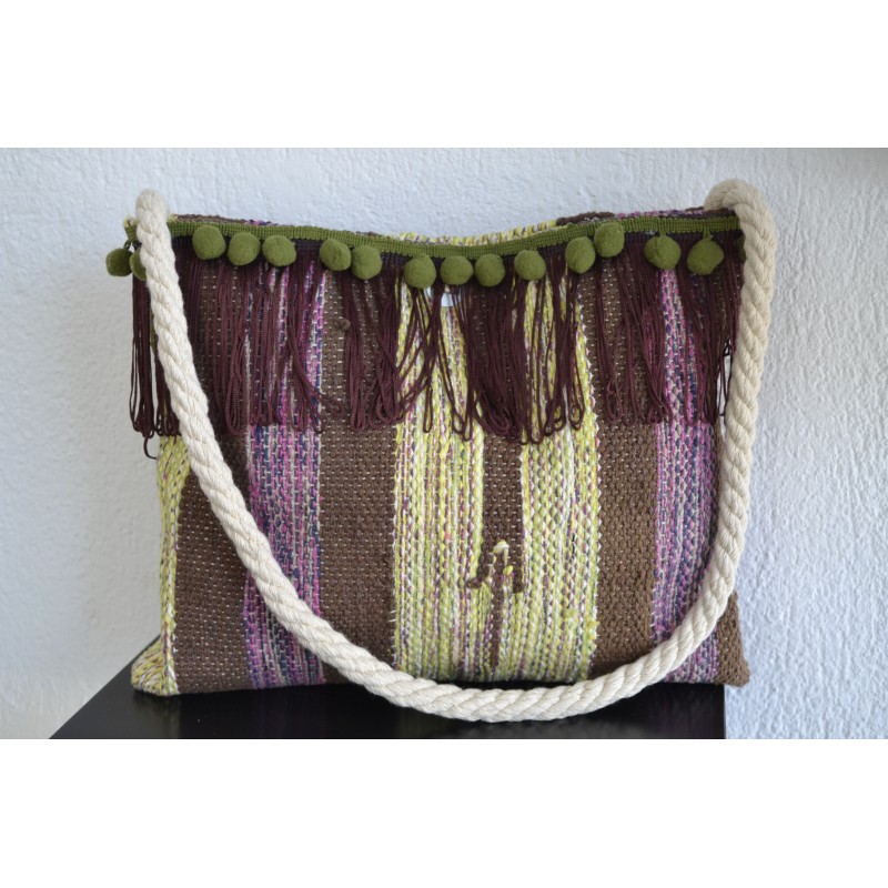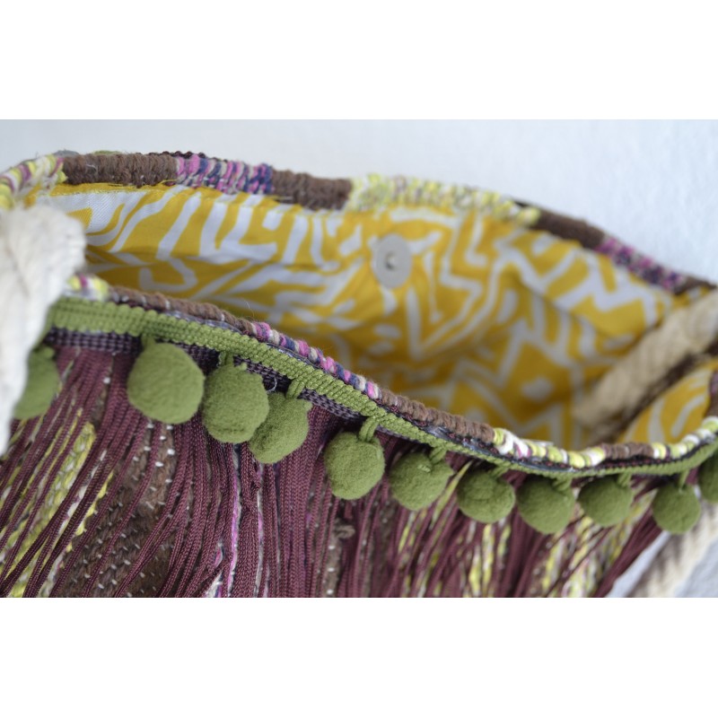 Τσάντα κουρελού χειροποίητη με κρόσσια και πον πον