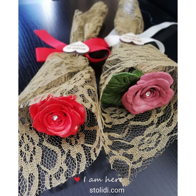 Τα τριαντάφυλλα είναι χειροποίητα από υλικό που δεν αλλοιώνεται θα τα έχετε για μια ζωή, επάνω έχουν στρας από swarovski είναι με μαγνήτη για να το βάλετε στο ψυγείο