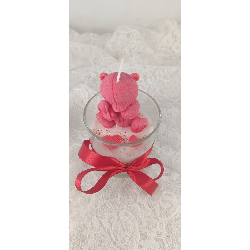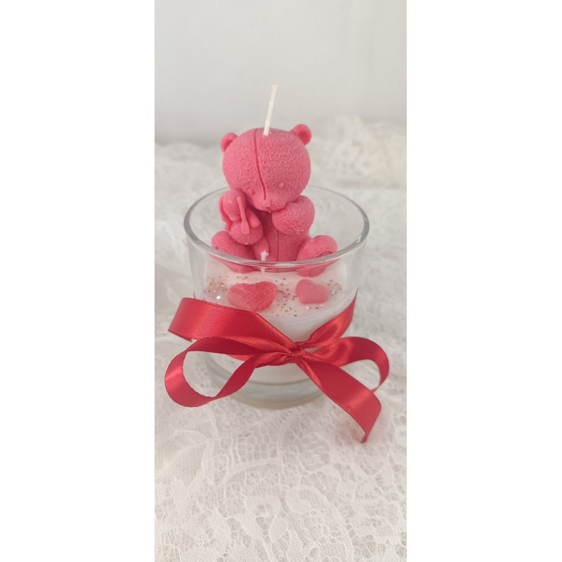 Ένα γλυκύτατο κερί σόγιας με άρωμα καθαριότητας, σε γυάλινο ποτήρι διακοσμημένο με κόκκινη σατέν κορδέλα. Το κόκκινο αρκουδάκι με το κουκλάκι στο χέρι λιώνει καρδιές και προσφέρει έναν αέρα φρεσκάδας και τρυφερότητας στον χώρο σου.