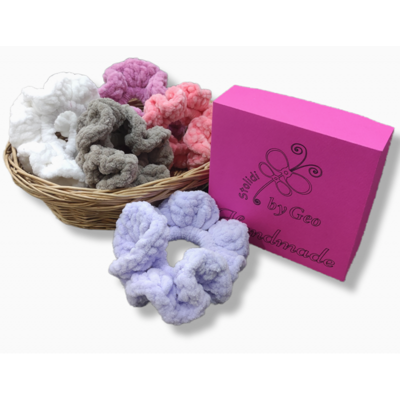 Υπέροχα χειροποίητα πλεκτά scrunchies σε διάφορα χρώματα.
