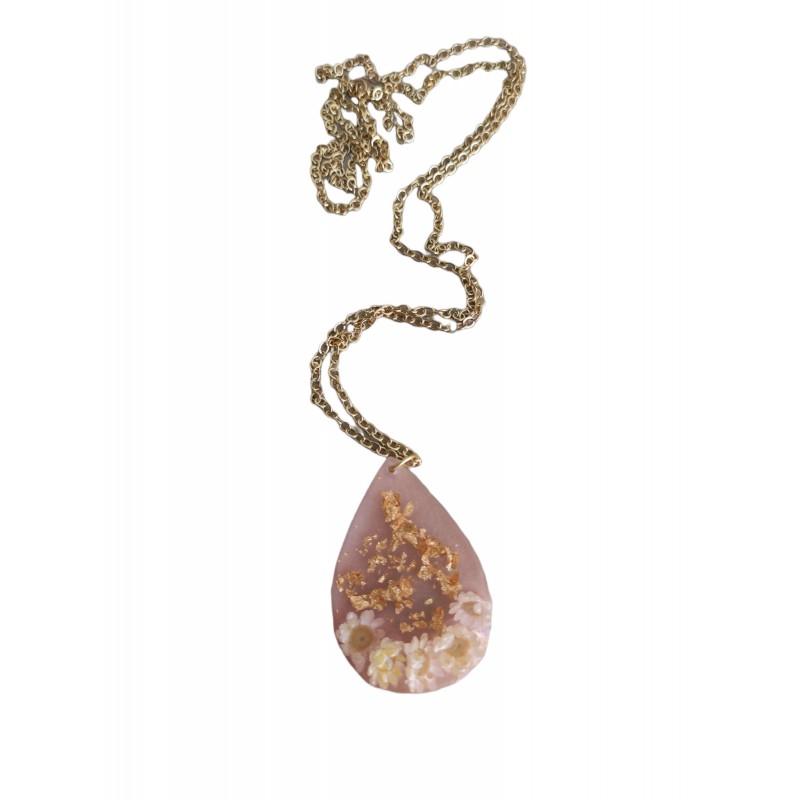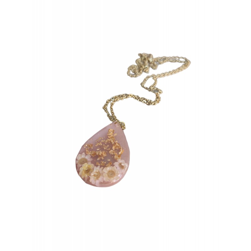 Χειροποίητο κολιέ απο υγρο γυαλί, σμάλτο σε παστέλ μπεζ χρώμα, φύλλα χρυσού και αποξηραμένα λουλούδια. Αλυσίδα ατσάλινη σε χρυσο χρώμα