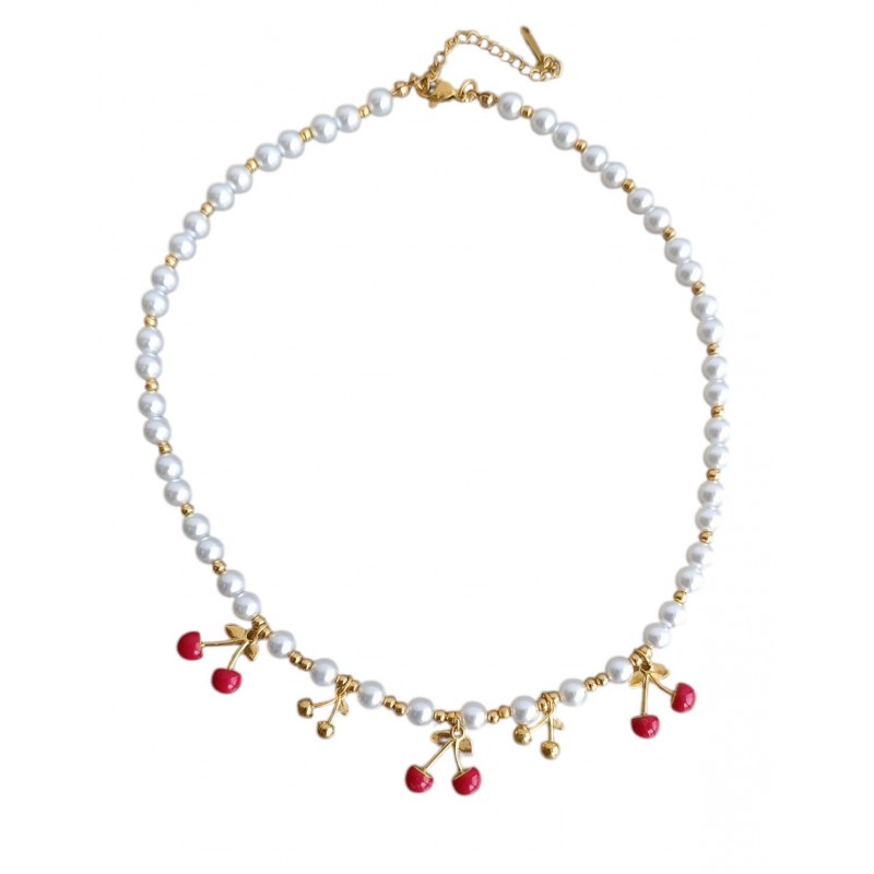 Ετικέτες: Χειροποίητο κολιέ με ΄λευκές πέρλες και κεράσια Διάσταση 45 εκ με την προέκταση