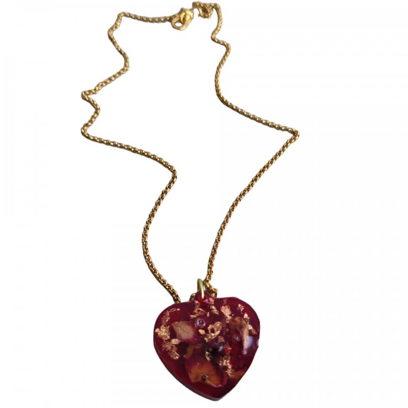 Χειροποίητο μενταγιόν καρδιά από ρητίνη σε κόκκινο χρώμα, με ροδοπέταλα και φύλλα χρυσού.Αλυσίδα ατσάλινη σε χρυσό χρώμα. Διάσταση 42 εκ