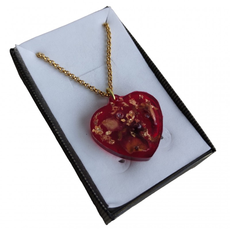 Ετικέτες: Χειροποίητο μενταγιόν καρδιά από ρητίνη σε κόκκινο χρώμα, με ροδοπέταλα και φύλλα χρυσού.Αλυσίδα ατσάλινη σε χρυσό χρώμα. Διάσταση 42 εκ