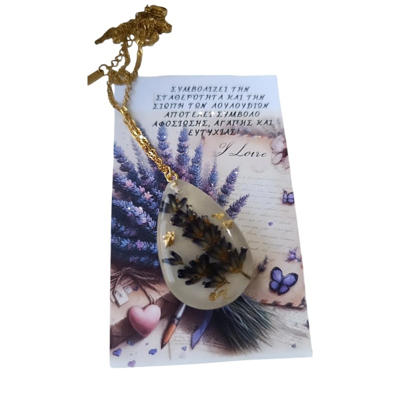 Χειροποίητο κολιέ σε δάκρυ με λεβάντα και φύλλα χρυσού