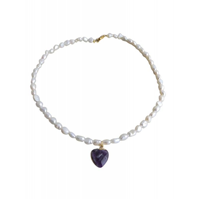 Χειροποίητο κολιέ με μαργαριτάρια σε λευκό χρώμα και ημιπολύτιμο λίθο αμέθυστο σε σχήμα καρδιά, διάσταση 42 εκ