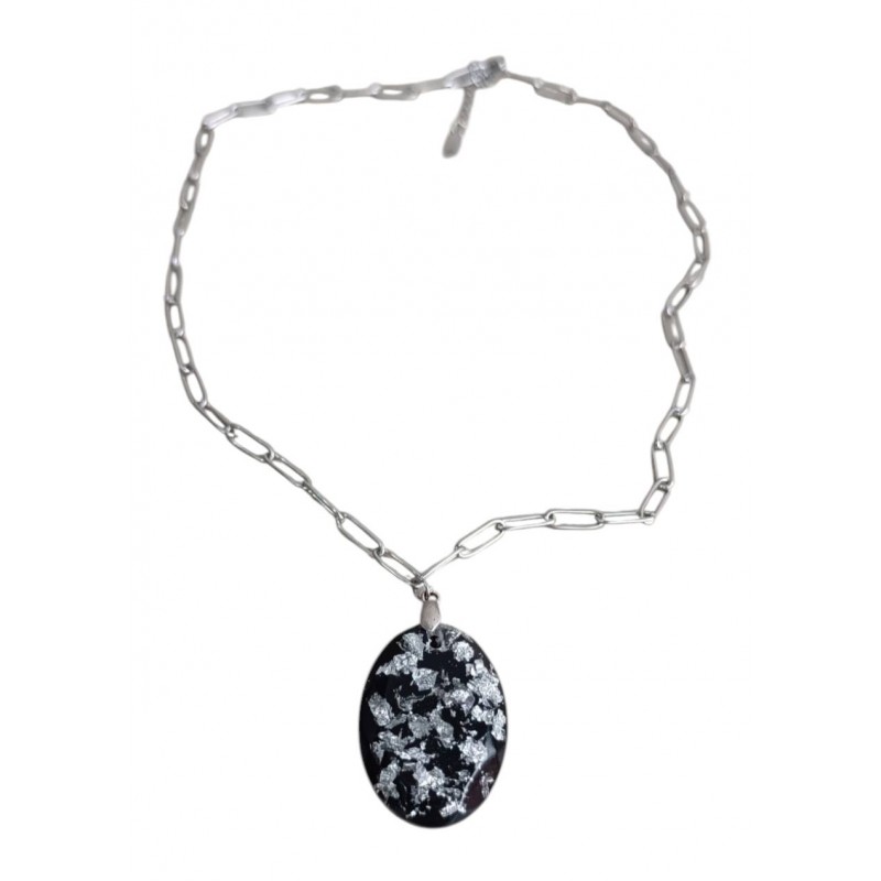 Χειροποίητο κολιέ με ασημένια ατσάλινη αλυσίδα και μενταγιόν μαύρο με φύλλα ασημιού