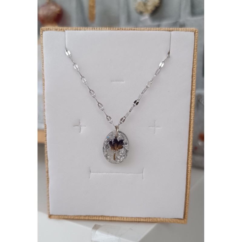 Χειροποίητο κολιέ με ατσάλινη ασημένια αλυσίδα και λε΄βάντα