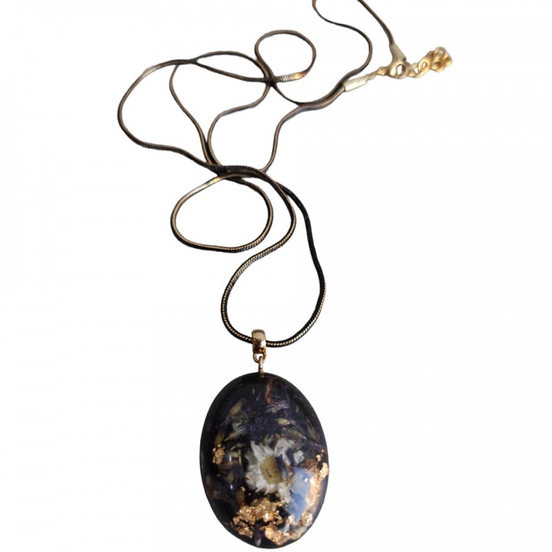 Ετικέτες: Χειροποίητο μενταγιόν με αληθινά αποξηραμένα λουλούδια Χαμομήλι - Μολόχα - Λεβάντα και φύλλα χρυσού Αλυσίδα διαμαντοκοπής σε μαύρο με χρυσό Διάσταση αλυσίδας 80 εκ Διάσταση μενταγιόν 5Χ4 εκ