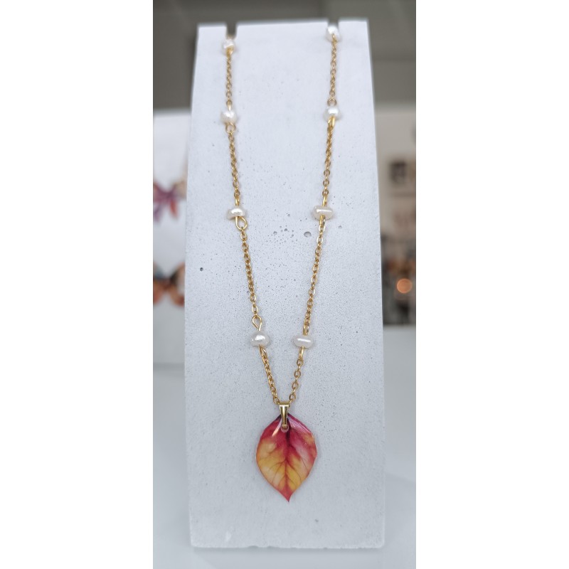 Χειροποίητο κολιέ με φύλλο τριανταφυλλιάς , μαργαριτάρια και χρυσή ατσάλινη αλυσίδα