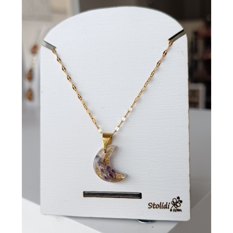 Στοιχείο σε σήμα φεγγαριού, κατασκευασμένο από ρητίνη, που περικλείει αληθινή αποξηραμένη λεβάντα και φύλλα χρυσού.