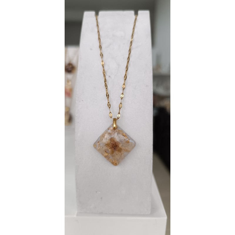 Ένα ρομαντικό και διαχρονικό κολιέ καρδιά, φτιαγμένο με αληθινά αποξηραμένα λουλούδια πανσεδάκι και μπλε γιασεμί, εγκλωβισμένα σε ρητίνη με διακριτικές νιφάδες χρυσού. Κάθε κόσμημα είναι μοναδικό, καθώς τα φυσικά στοιχεία του δεν επαναλαμβάνονται ποτέ με τον ίδιο τρόπο.