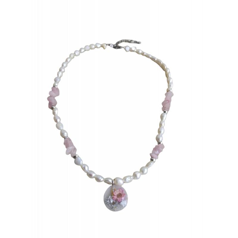 Χειροποίητο κολιέ με μαργαριτάρια σε λευκό χρώμα με πέτρες αχάτη σε διάφορα σημεία και στοιχείο στο κέντρο με αληθινά αποξηραμένα λουλούδια, διάσταση 42 εκ