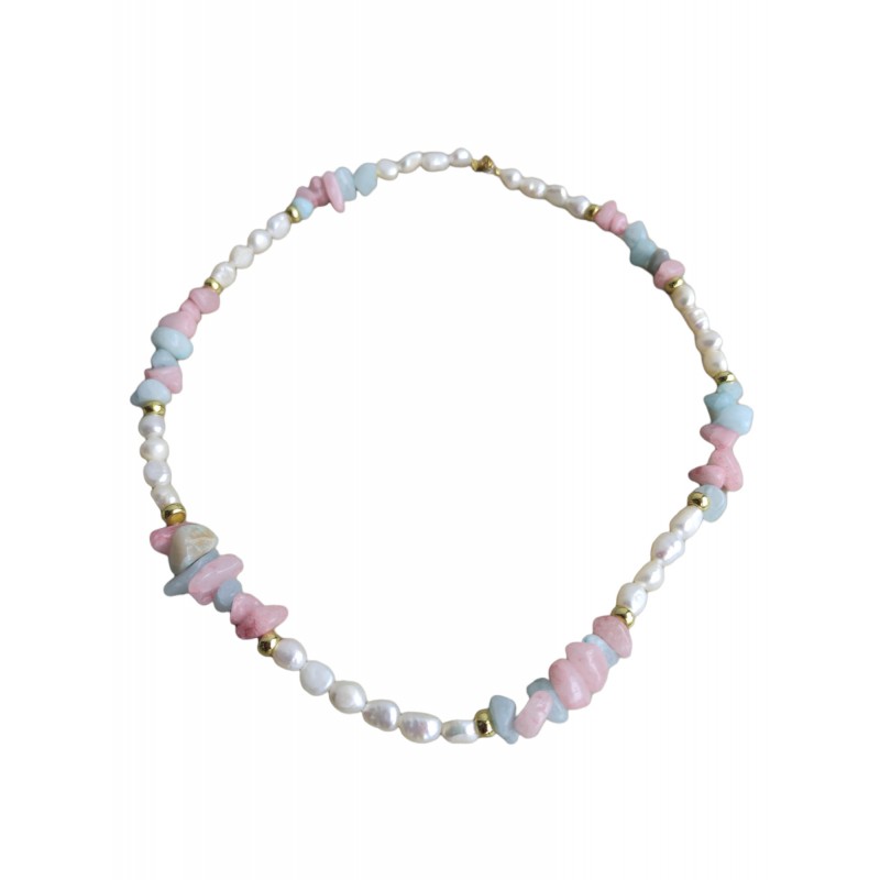 Χειροποίητο κολιέ με μαργαριτάρια σε λευκό χρώμα με πέτρες αχάτη σε διάφορα σημεία διάσταση 42 εκ