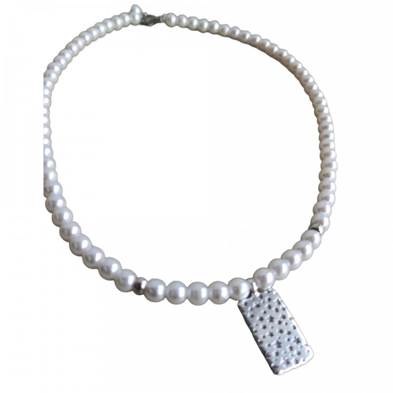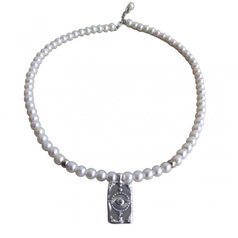 Κολιέ χειροποίητο με πέρλες και μεταλλικό μοτίφ σε ασημένιο χρώμα , δύο όψεων, από την μία πλευρά έχει μάτι και από την άλλη αστεράκια. Διάσταση με την προέκταση 40-45 εκ