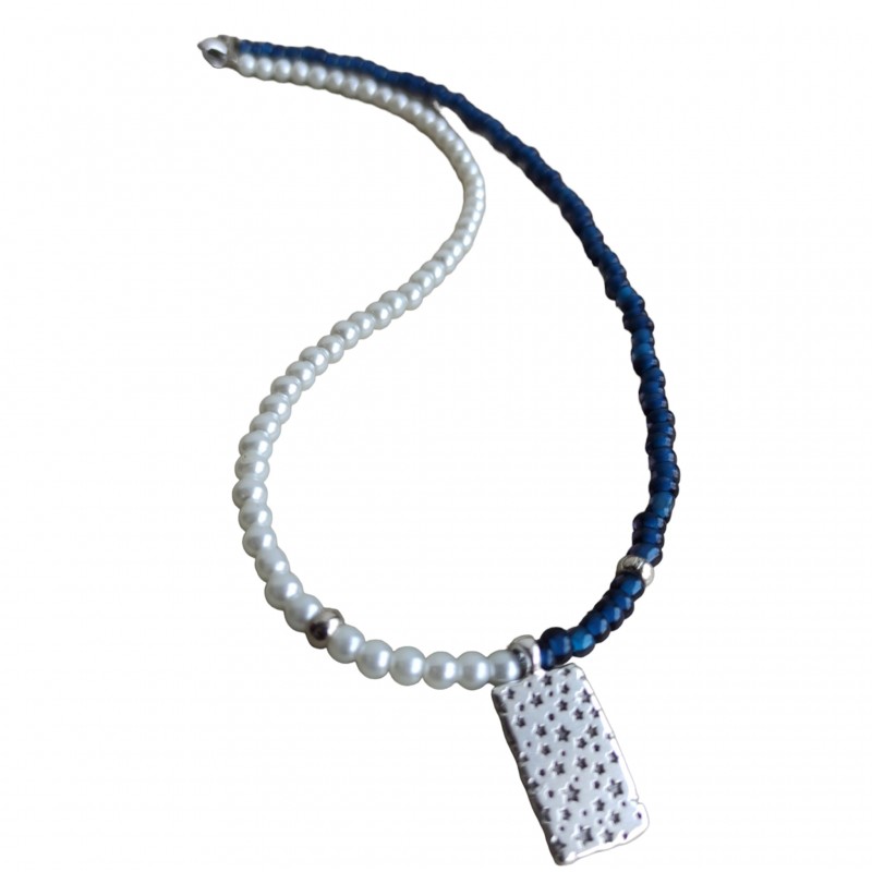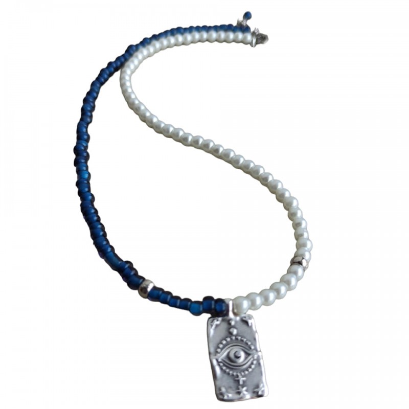 Κολιέ χειροποίητο με μπλε χάντρες, πέρλες και μεταλλικό μοτίφ σε ασημένιο χρώμα , δύο όψεων, από την μία πλευρά έχει μάτι και από την άλλη αστεράκια. Διάσταση με την προέκταση 40-45 εκ