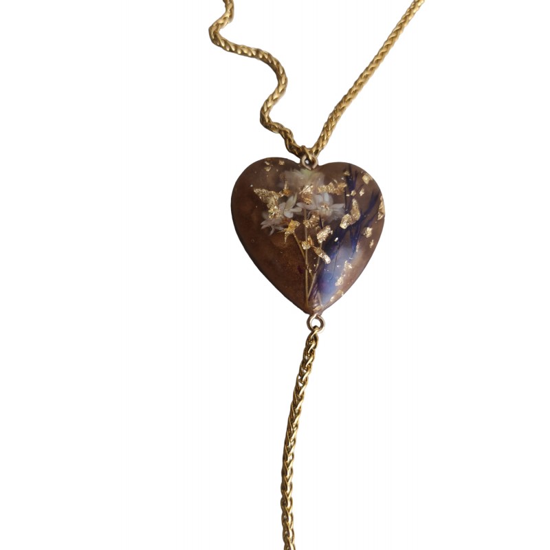 Χειροποίητο κολιέ μενταγιόν με καρδιά με αποξηραμένα αληθινά λουλούδια και ατσάλινη χρυσή αλυσίδα