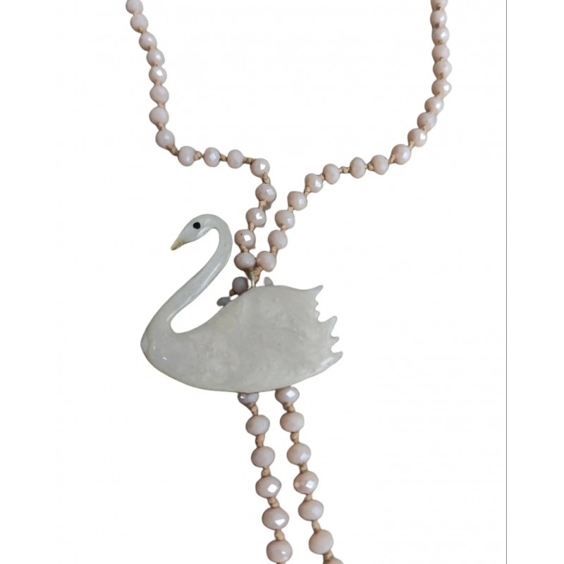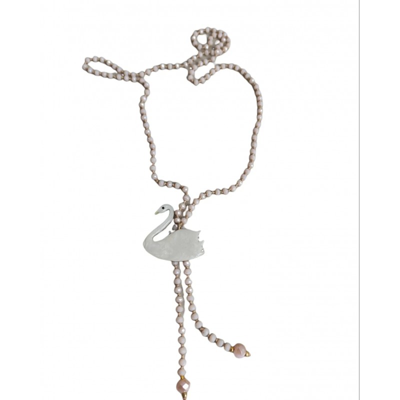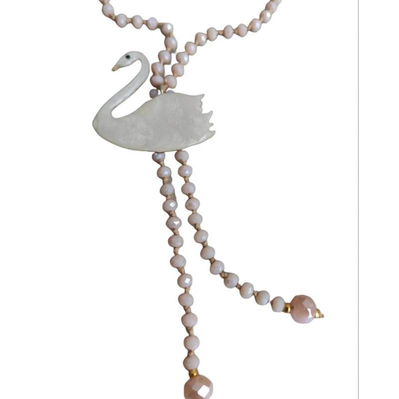 Χειροποίητο κολιέ κύκνος λευκός από μέταλλο ορείχαλκου με κρύσταλλα σε μπεζ χρώμα