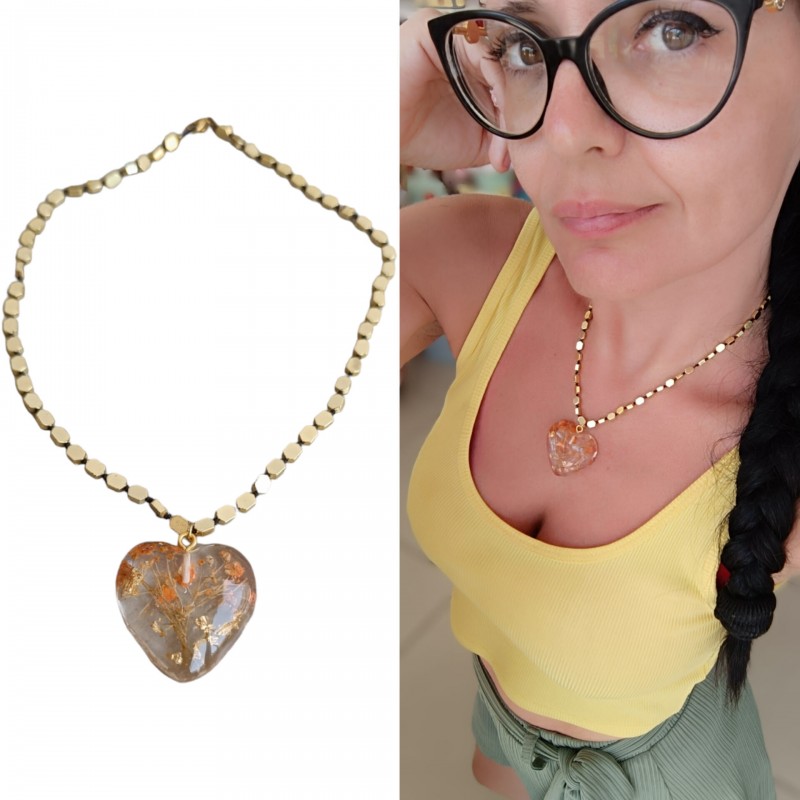Χειροποίητο κολιέ με αληθινά λουλούδια σε καρδιά και αλυσίδα από ημιπολύτιμο λίθο αιματίτη επιχρυσωμένο