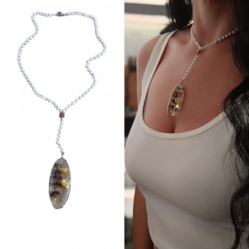 Ετικέτες: Χειροποίητο κολιέ με αποξηραμένη λεβάντα και Γλίξια, σε στυλ ροζάριο Αλυσίδα απο κρύσταλλα σε λευκό χρώμα Μήκος γύρω από το λαιμό 42 εκ
