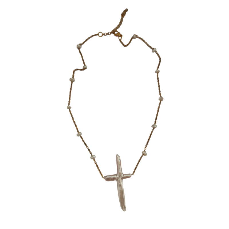 Χειροποίητο κολιέ με ατσάλινη αλυσίδα, Σταυρό από μαργαριτάρι και μικρά μαργαριτάρια