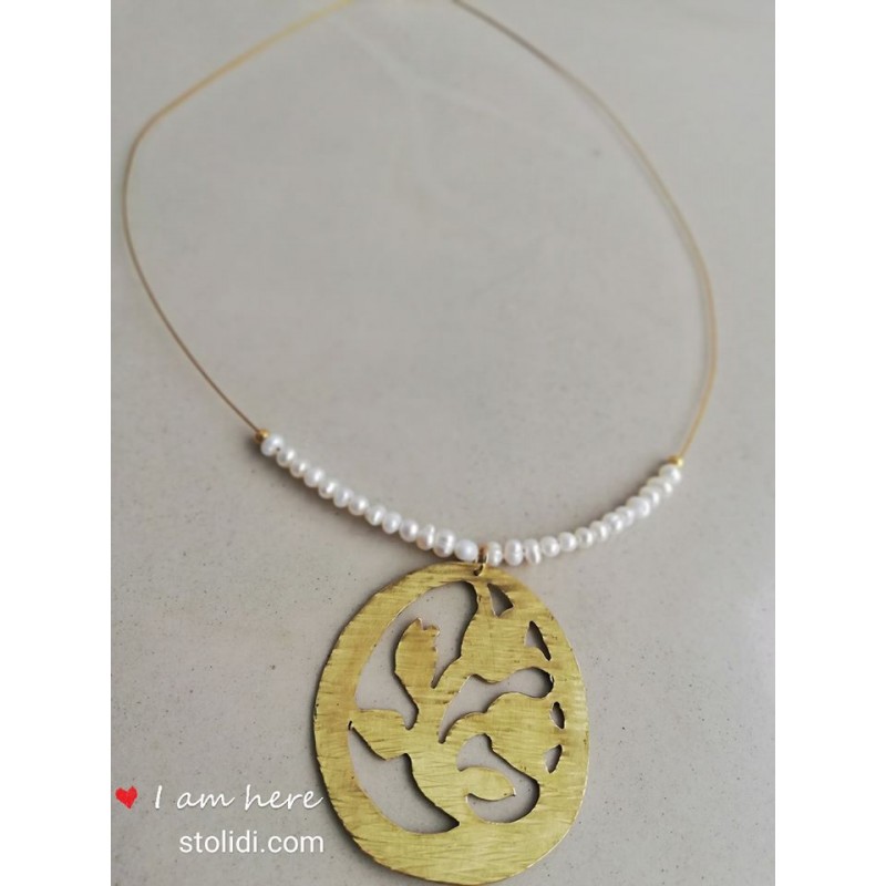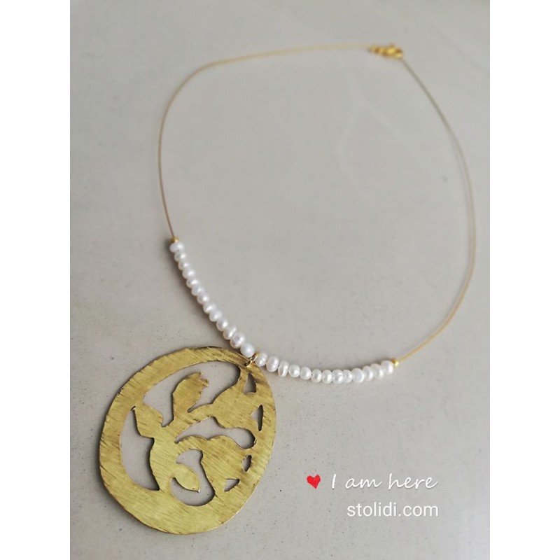Κολιέ με μαργαριτάρι χρυσή ντίζα και χειροποίητο μενταγιόν από ορείχαλκο