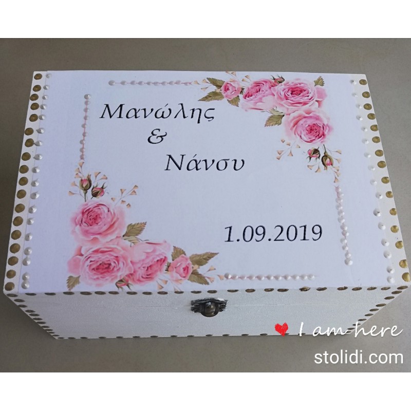 Χειροποίητο ξύλινο κουτί αποθήκευσης αναμνηστικών γάμου με τα ονόματα και την ημερομηνία του γάμου