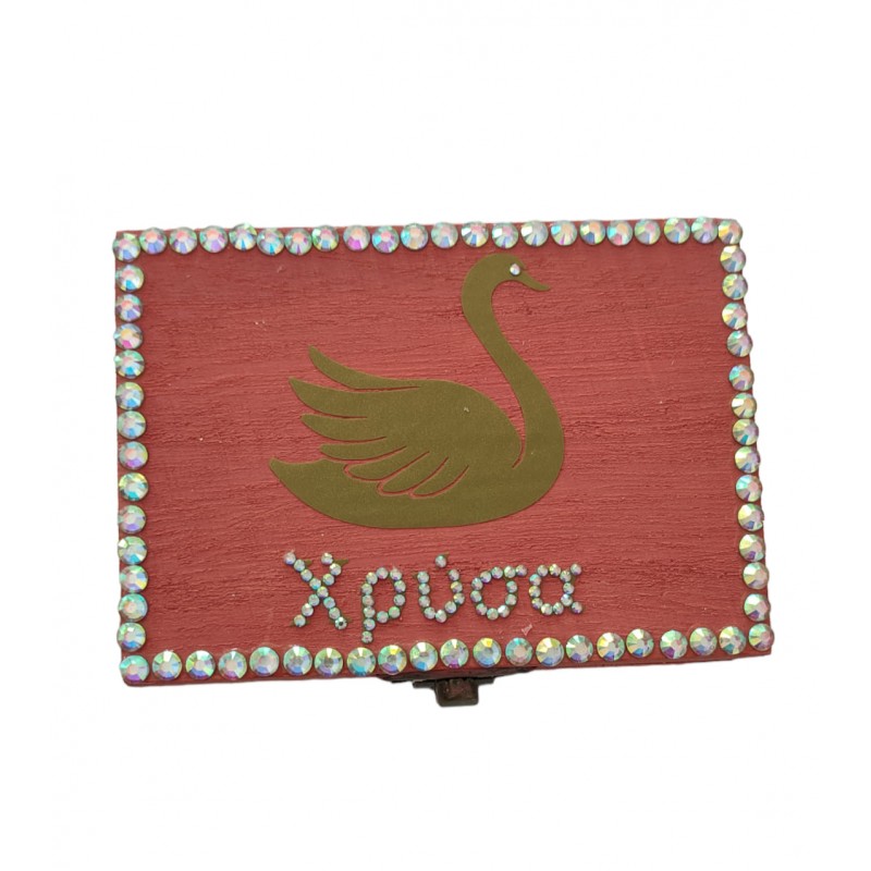 Ξύλινο κουτί για τον βαπτιστικό Σταυρό με θέμα τον κύκνο και το όνομα του παιδιού με στρας