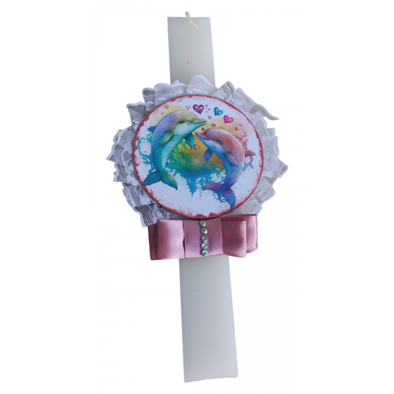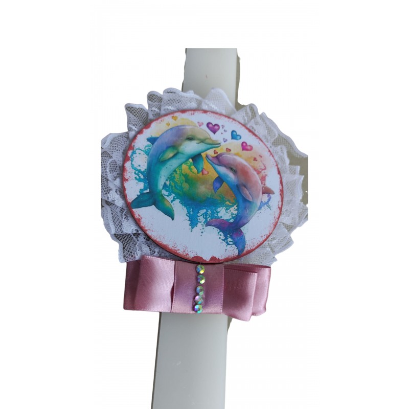 Χειροποίητη πλακέ λαμπα΄δα 30 εκ σε λευκό χρώμα με κορνιζάκι ερωτευμένα δελφίνια