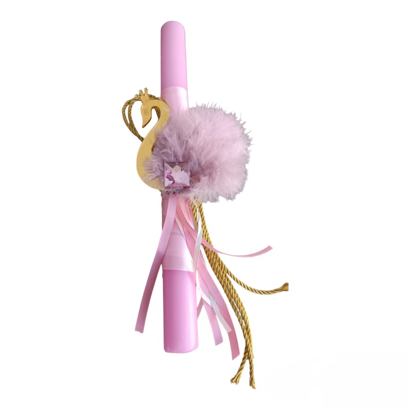 Χειροποίητη λαμπάδα ροζ 30 εκ με κύκνο από χρυσό plexiglass