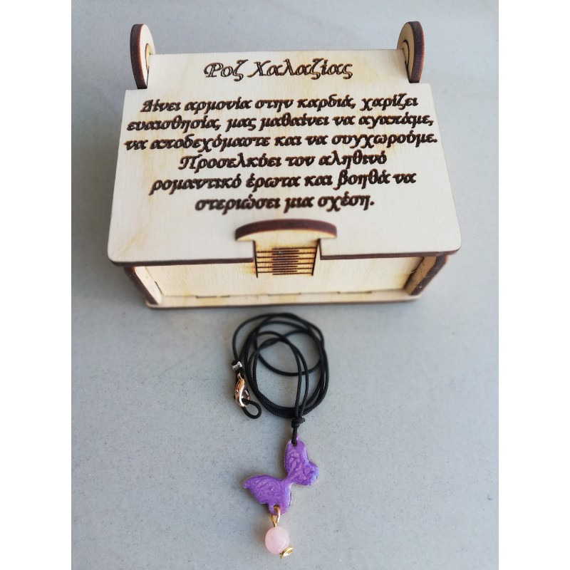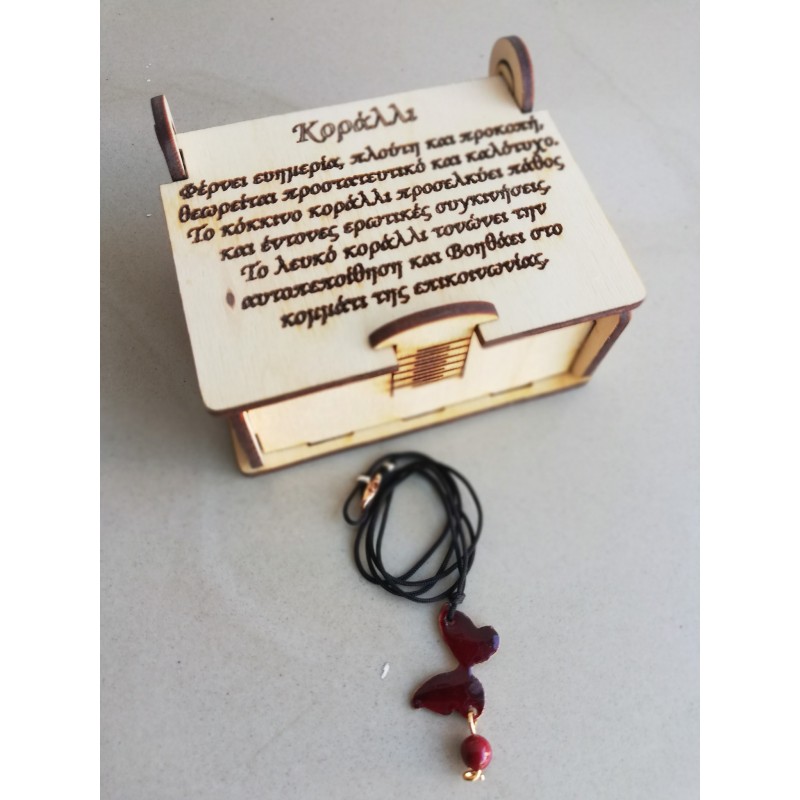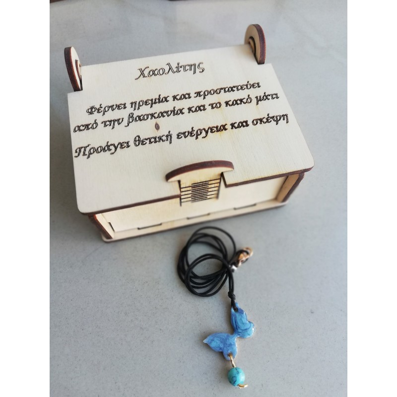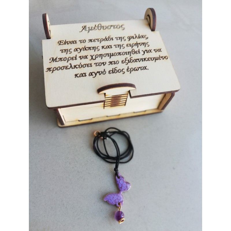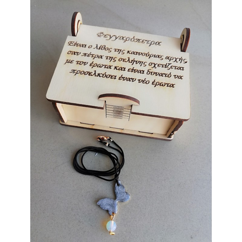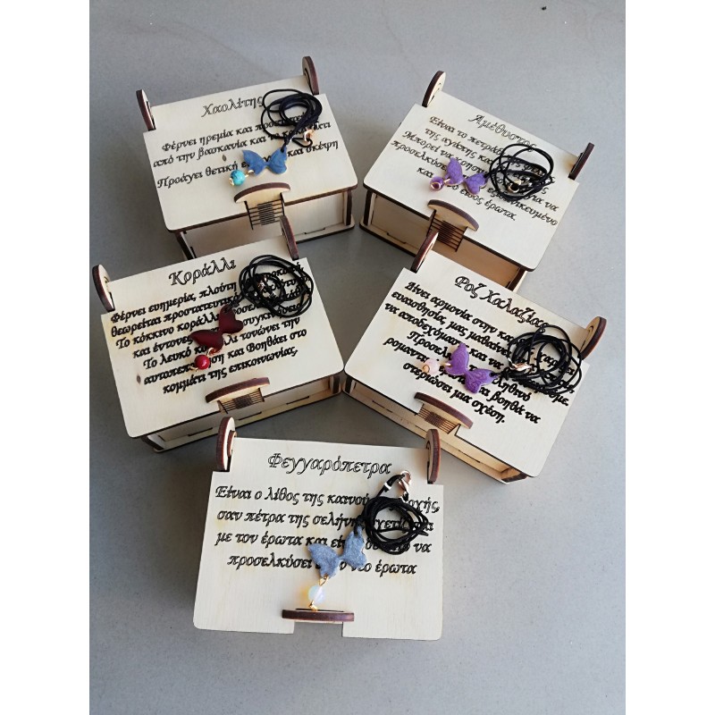Το κάθε μενταγιόν συνοδεύεται από την ξύλινη μπιζουτιέρα που στο καπάκι αναγράφονται οι ιδιότητες του κάθε λίθου