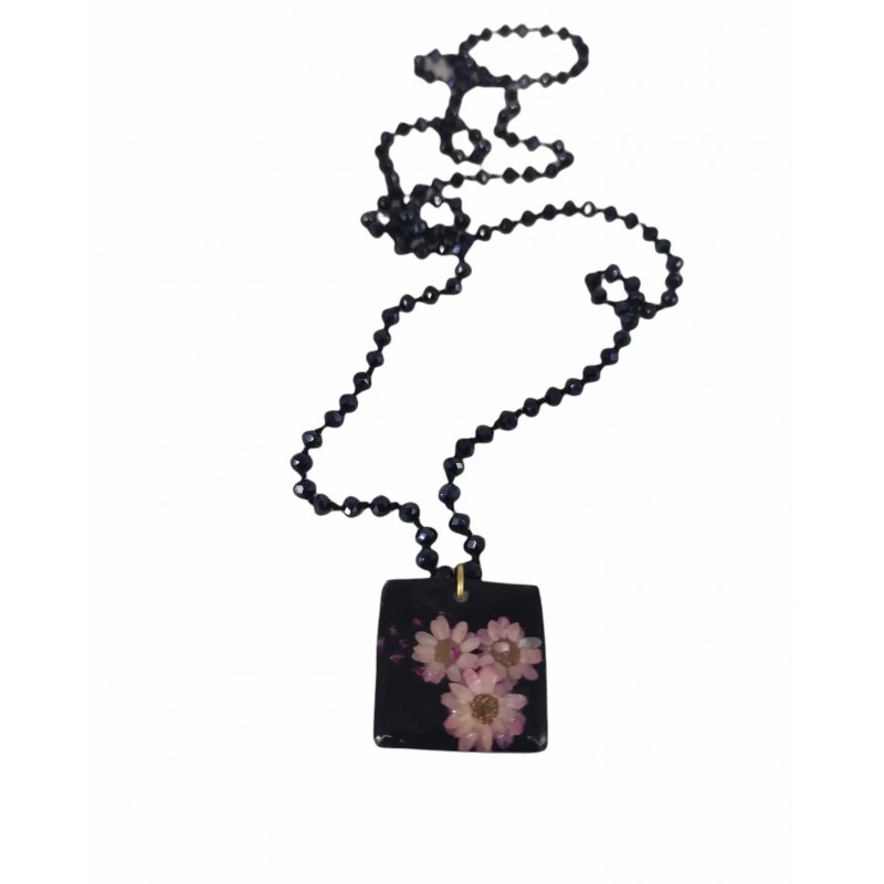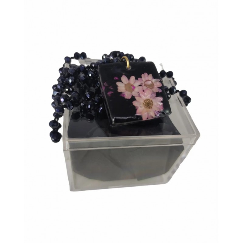 Χειροποίητο κολιέ με αληθινά αποξηραμένα λουλούδια, αλυσίδα από σκούρο μπλε μεταλιζέ κρύσταλλα και μενταγιόν σε μαύρο και μωβ