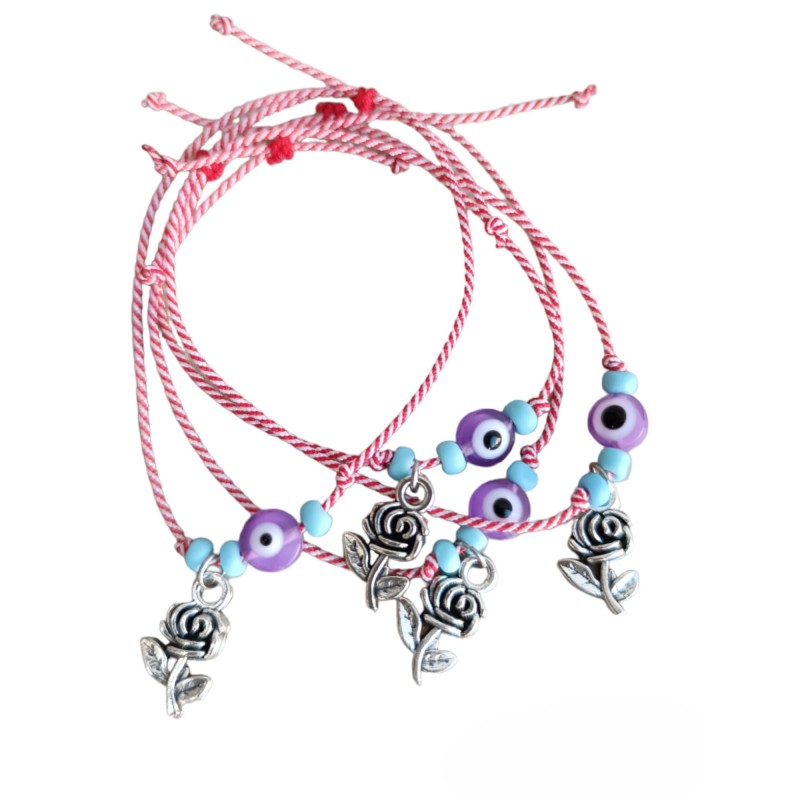 Ετικέτες: Μαρτάκι με μωβ ματάκι, γαλάζιες χάντρες και μεταλλικό λουλούδι