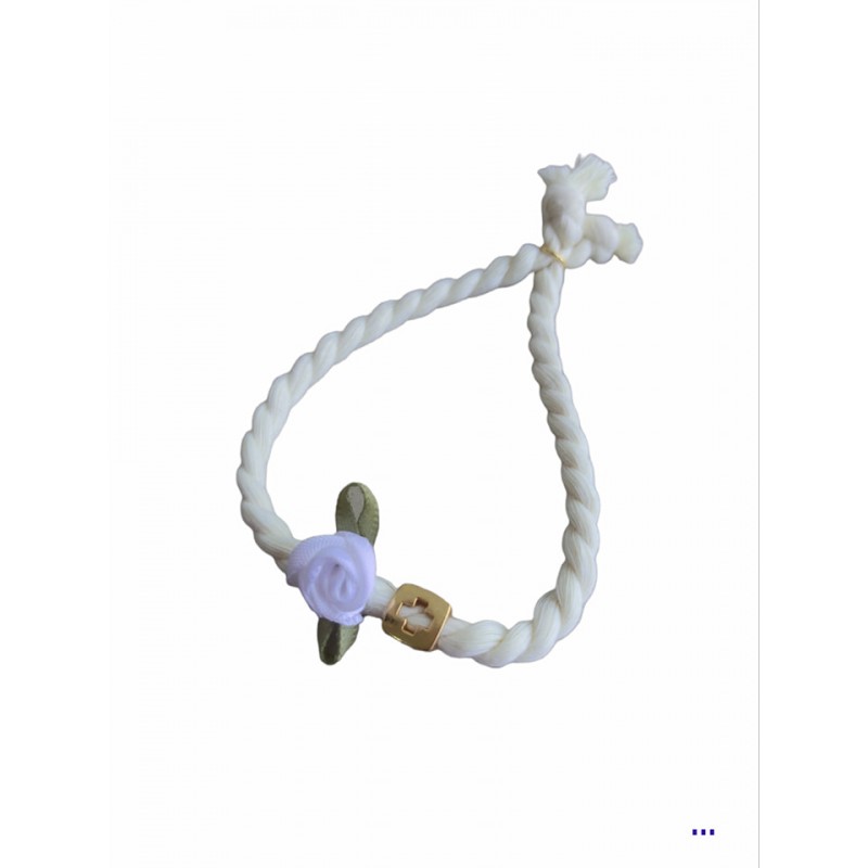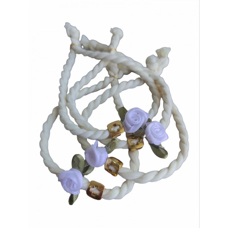 Μαρτυρικά βάπτισης με μπεζ βαμβακερό κορδόνι χρυσό Σταυρό και λουλούδι σε λευκό χρώμα