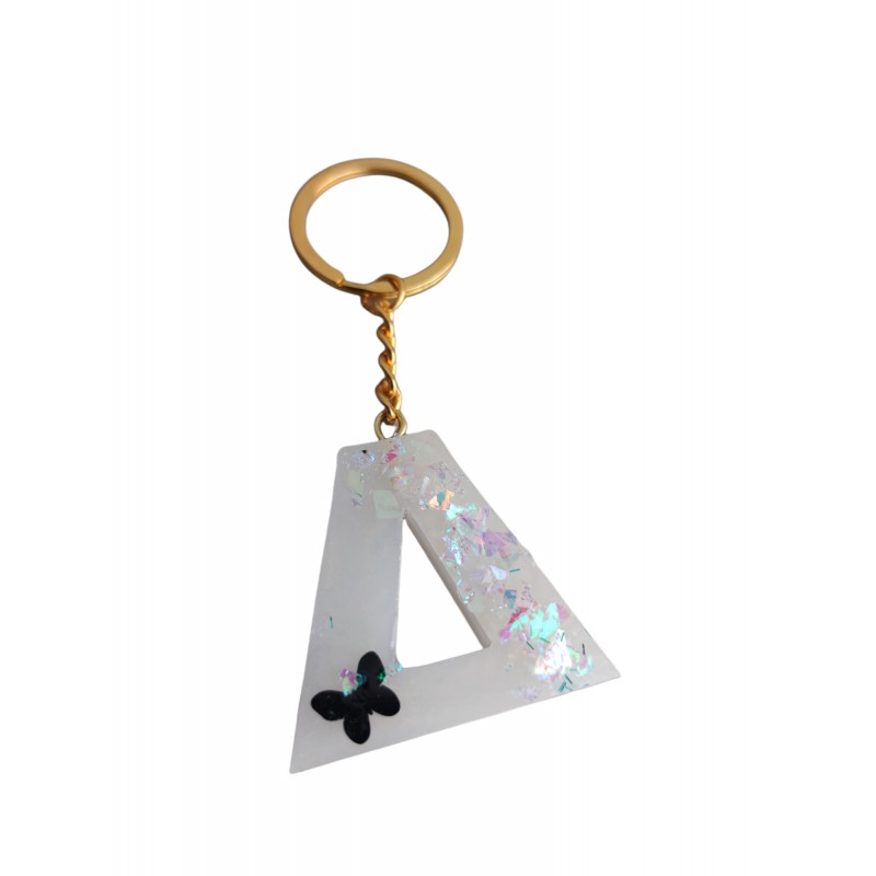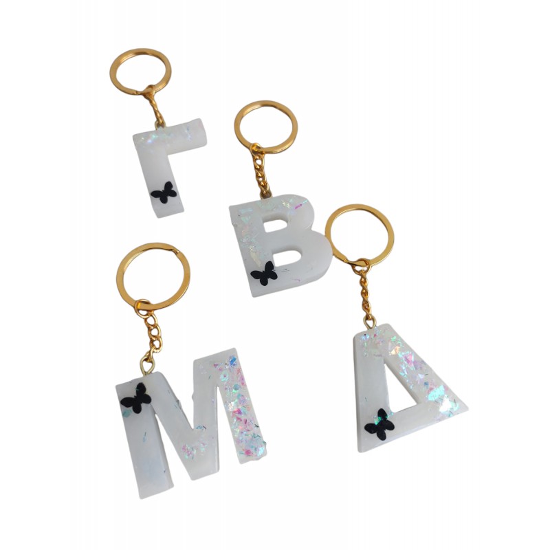 Μπρελοκ μονόγραμμα χειροποίητο με το γράμμα της επιλογής σου σε λευκό χρώμα με γκλίτερ και μαύρη πεταλούδα