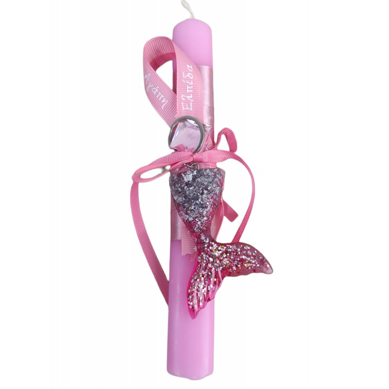 Ετικέτες: Λαμπάδα με χειροποίητο μπρελόκ από υγρό γυαλί ουρά γοργόνας σε ροζ χρώμα με φύλλα ασημιού