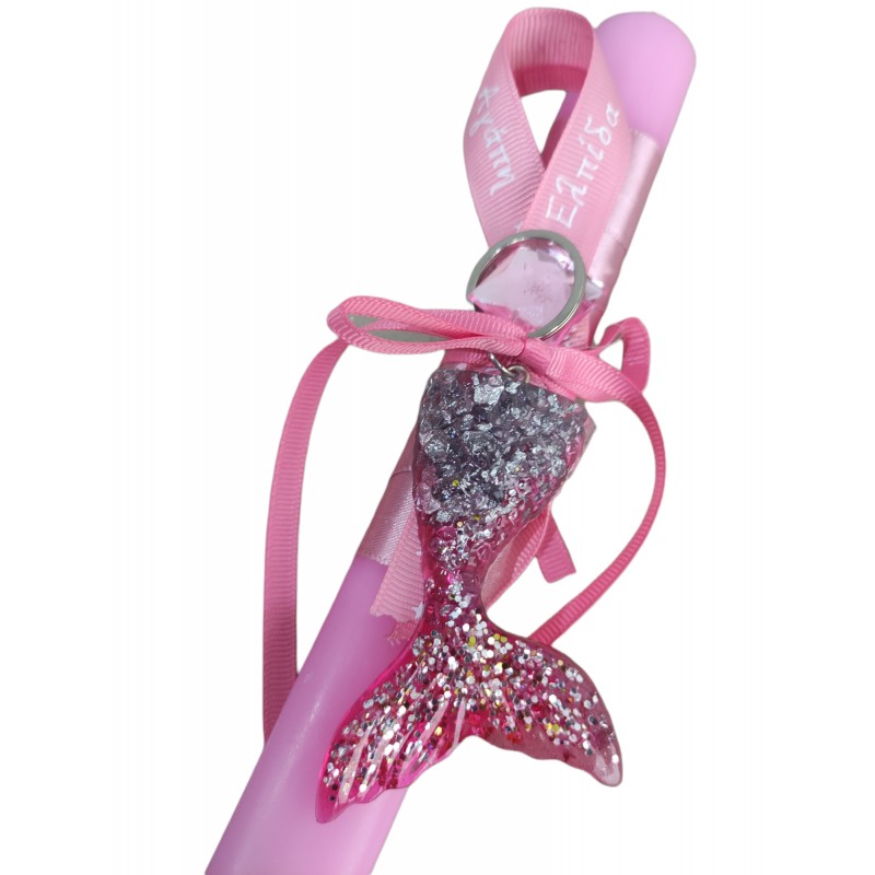Λαμπάδα με χειροποίητο μπρελόκ από υγρό γυαλί ουρά γοργόνας σε ροζ χρώμα με φύλλα ασημιού