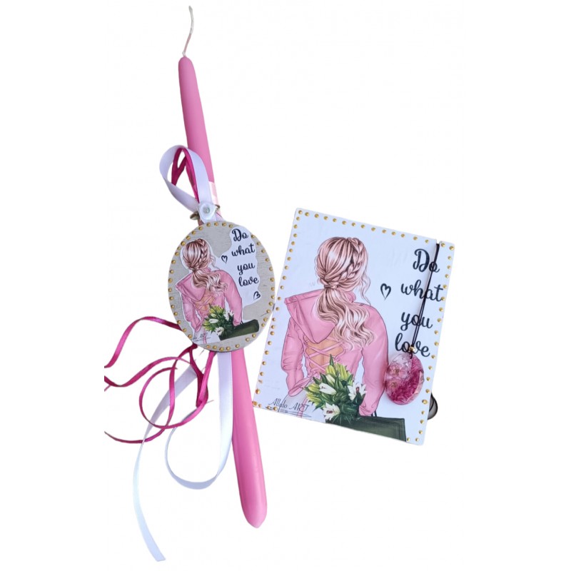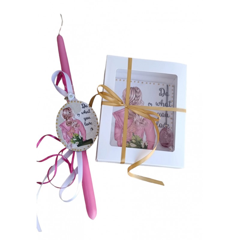 Ετικέτες: Πασχαλινό πακέτο δώρου που περιλαμβάνει χειροποίητο κόσμημα το οποίο περιέχει αληθινά λουλούδια, Καδράκι με λογότυπο "do what you love " Και αντίστοιχη λαμπάδα
