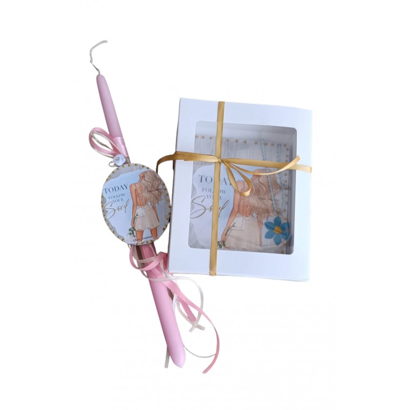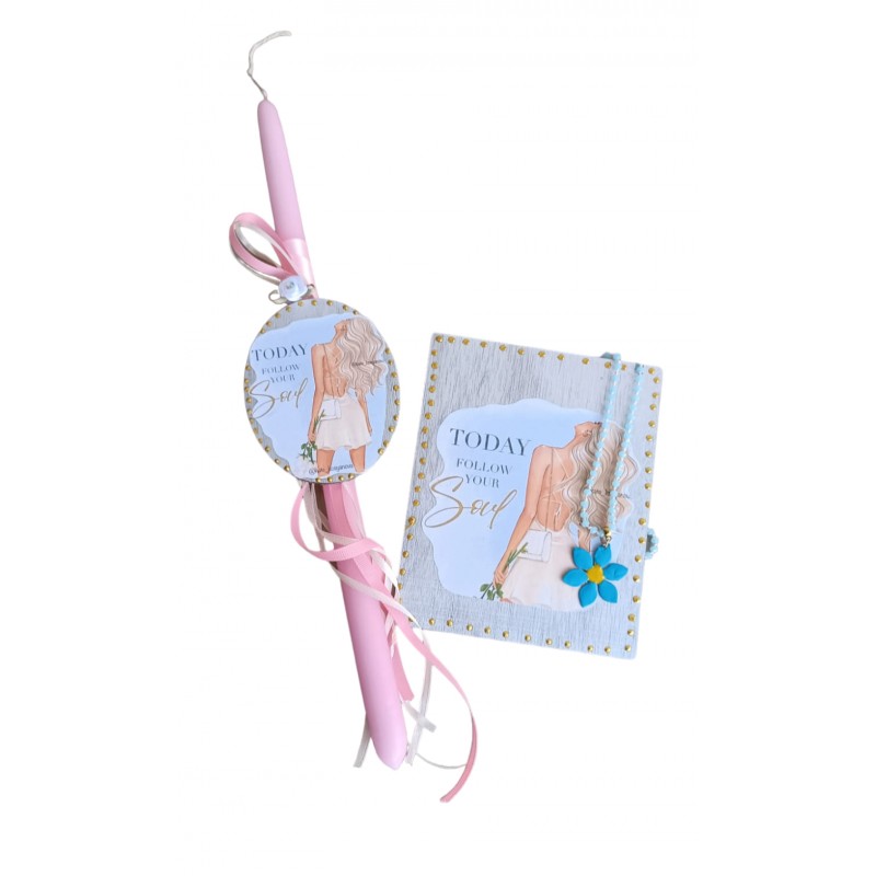 Ετικέτες: Πασχαλινό πακέτο δώρου που περιλαμβάνει χειροποίητο κόσμημα Καδράκι με λογότυπο "today follow your soul " Και αντίστοιχη λαμπάδα