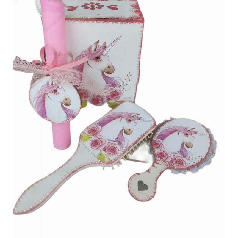 Πασχαλινό σετ που περιλαμβάνει λαμπάδα, κουτί αποθήκευσης, χτένα, καθρέφτη και λαμπάδα με θέμα τον μονόκερο